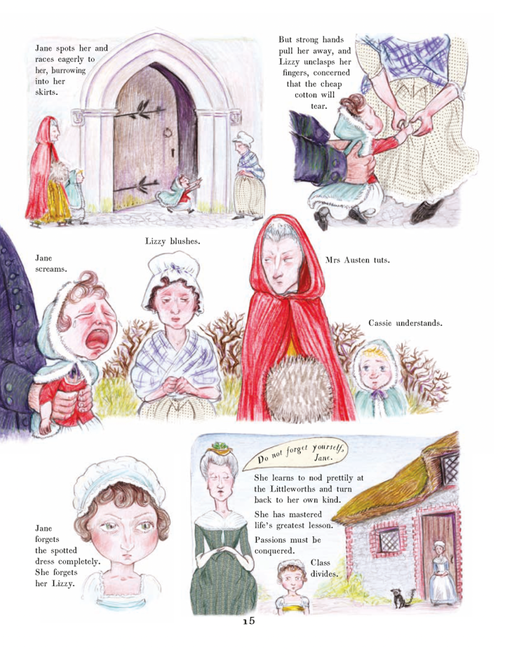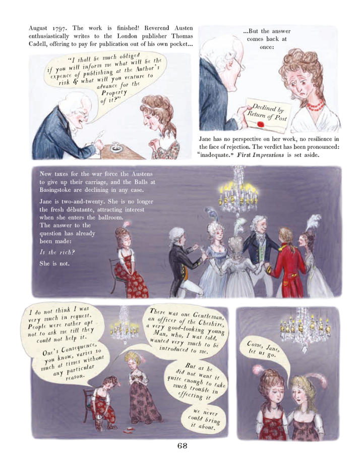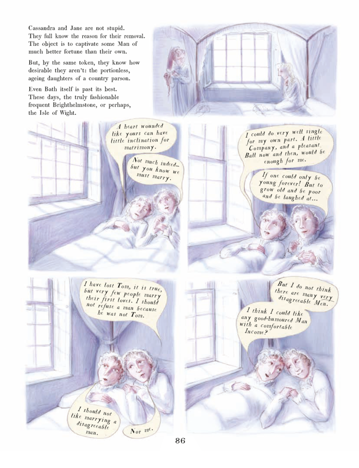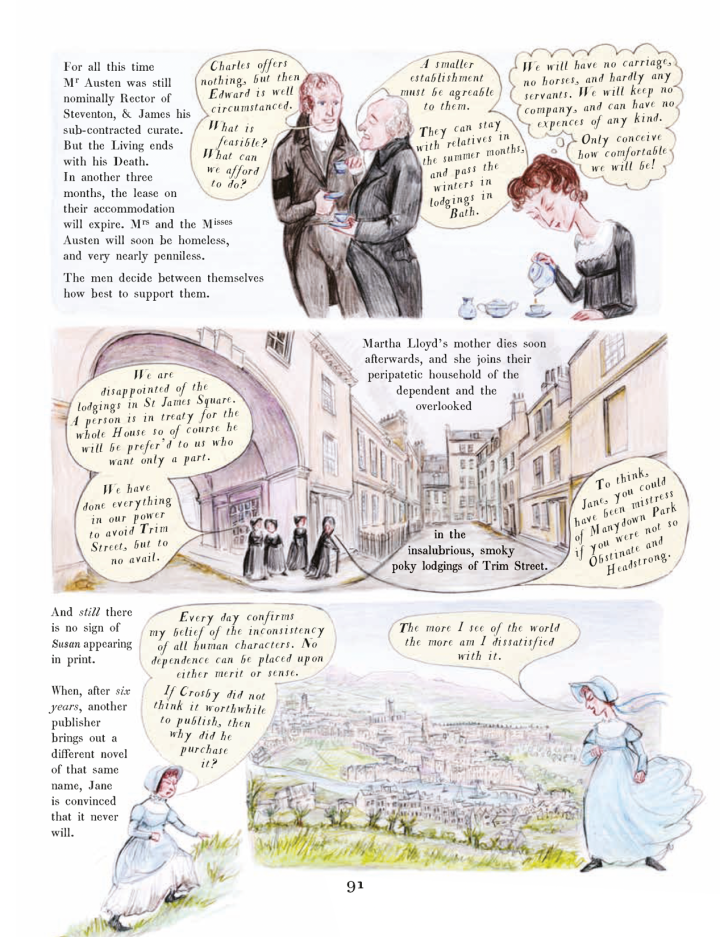 类似的对照也体现在今年出版的两部奥斯丁图像传记上。4月出版的由珍妮·巴查斯(JanineBarchas)撰文、伊莎贝尔·格林伯格(IsabelGreenberg)绘图的《简·奥斯丁的小说人生》(TheNovelLifeofJaneAusten:AGraphicBiography),聚焦于简·奥斯丁平静生活中的三个关键时期:《傲慢与偏见》被拒稿,父亲去世后投靠哥哥弗兰克,成功出版《理智与情感》。这些特定片段展现了奥斯丁日常生活的纹理。相比之下,左翼出版社Verso在10月出版的《百纳成锦》(Patchwork:AGraphicBiographyofJaneAusten),则完整细腻地绘制了奥斯丁的一生,同时将其纳入了更广阔的世界图景。