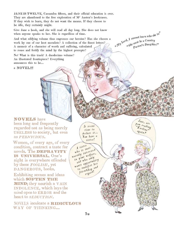 简十二岁,卡桑德拉十五岁,她们的正式教育已告终结。奥斯丁先生的书架向她们敞开,任其自由探索。若她们有心向学,绝不乏途径;若选择懒散度日,也尽可随心。给简一本书,她便能终日沉浸其中。旁人同她说话时,她充耳不闻;时光流逝,她浑然不觉。究竟是何种启迪心智的巨著令我们的女主角如此痴迷?莫非她选择了某位道德大师的著作?抑或是一部精妙书简集?再不然就是某位历经磨难的高尚人物回忆录,旨在以至理箴言唤醒心灵、砥砺意志?非也!这堆废纸是什么!十二开的小册子?带插画的扉页?种种迹象都表明这竟是……一本小说!!!