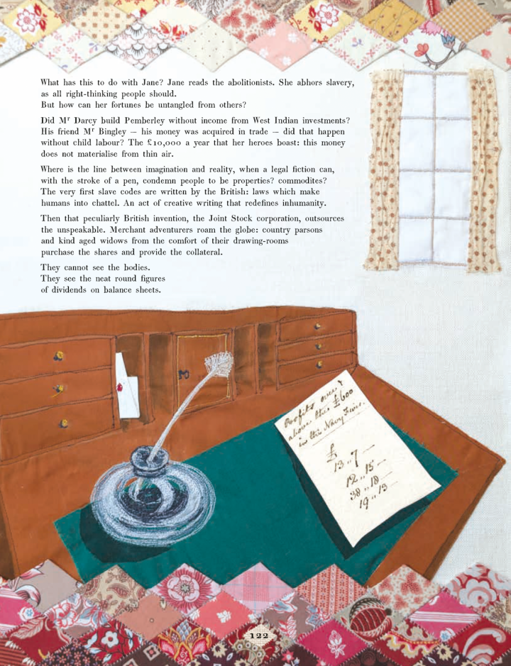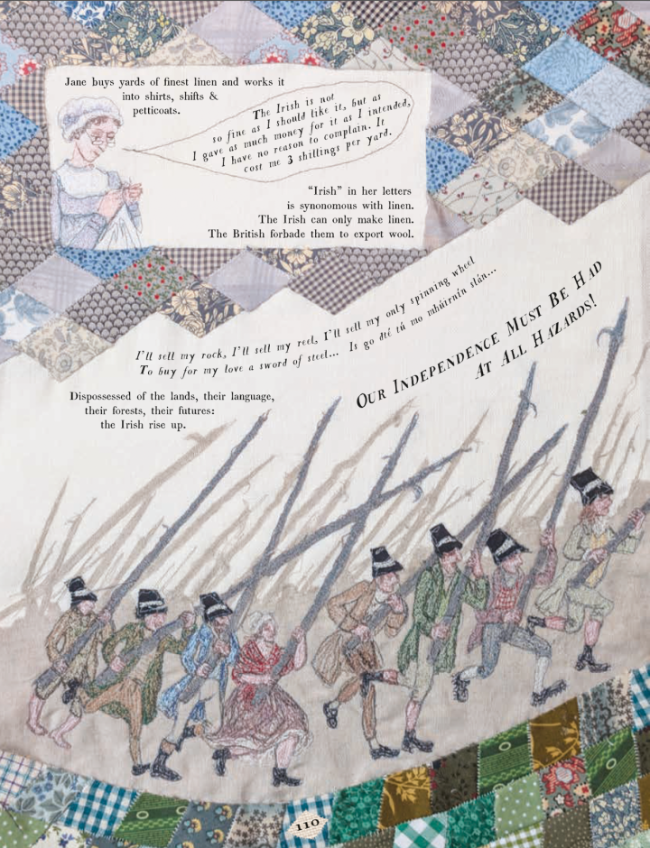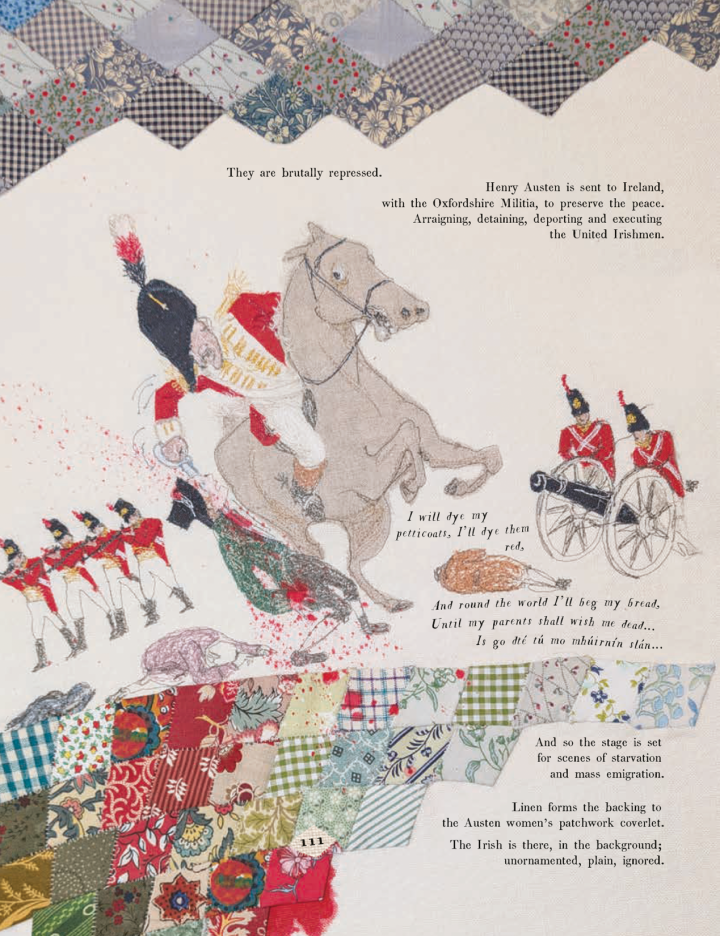 于是,饥饿与大规模移民的场景就此铺开。亚麻布构成了奥斯丁家族女性拼布被的衬底。爱尔兰人就在那里,在背景里;未经装饰,朴素无华,无人问津。