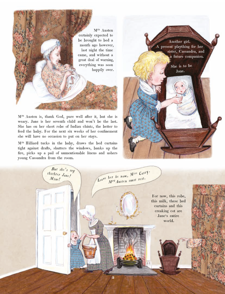 感谢上帝,奥斯丁太太产后一切安好,只是疲惫不堪。简是她的第七个孩子,但不会是最后一个。她身着印度印花棉布短袍,以便更好地哺乳婴儿。在接下来的六周产褥期里,她无需再穿束身衣。希利亚德太太为婴儿掖好被角,拉紧床帷以防穿堂风,合上百叶窗,拨旺炉火,提起一桶不便明说的换洗衣物,领着年幼的卡桑德拉离开了房间。