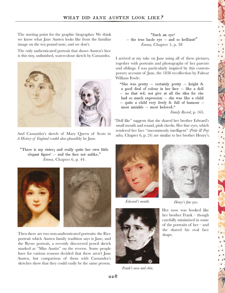 我通过综合所有这些画像,连同她父母及兄弟姐妹的肖像与照片,形成了对简的理解。尤其让我深受启发的是同时代人富尔沃·威廉·福尔1838年对简的这段记述: