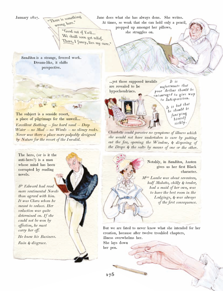 那些所谓的病患其实不过是些疑病症患者。主人公(或者说反英雄?)是一个因阅读小说而心智扭曲的人。值得注意的是,在《桑迪顿》中,奥斯丁塑造了她的首位黑人角色。