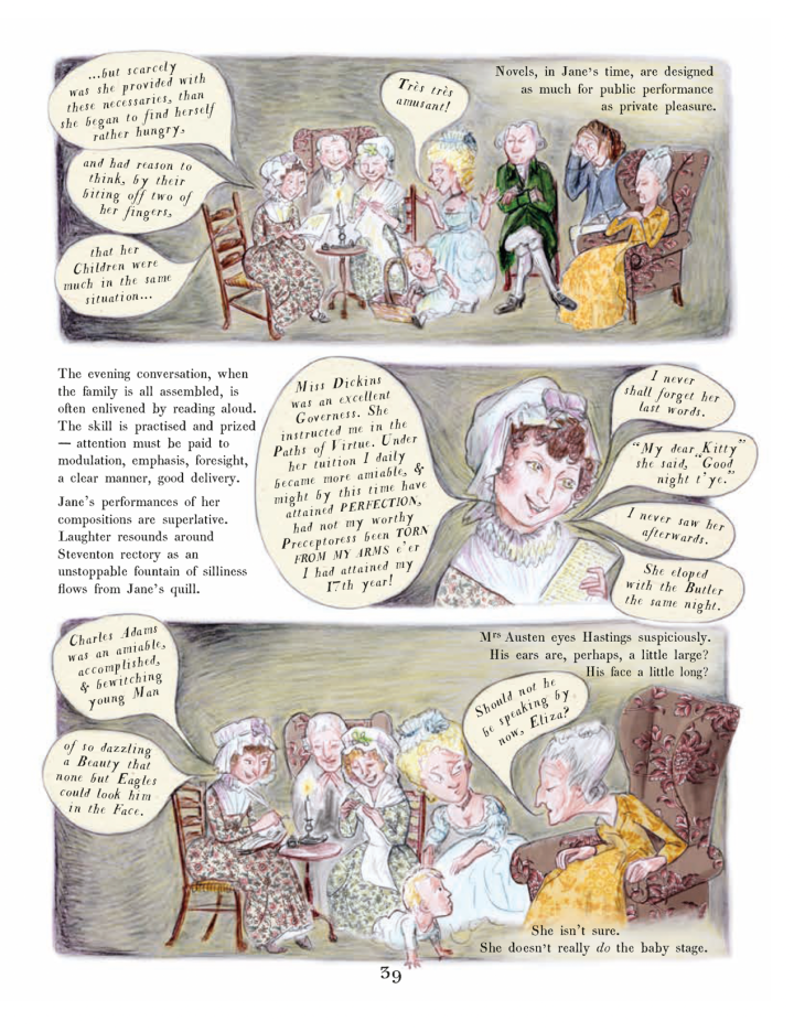 当全家人晚间聚在一起时,朗读常为谈话增添生气。这项技艺需要练习并备受珍视——必须注重语调的抑扬顿挫、重音处理、对语意走向的预判、清晰的表达方式以及良好的传达技巧。简在朗诵自己作品时的表现堪称绝妙。当简的笔尖流淌出源源不断的俏皮文字时,史蒂文顿教区牧师住宅里总是回荡着欢声笑语。
