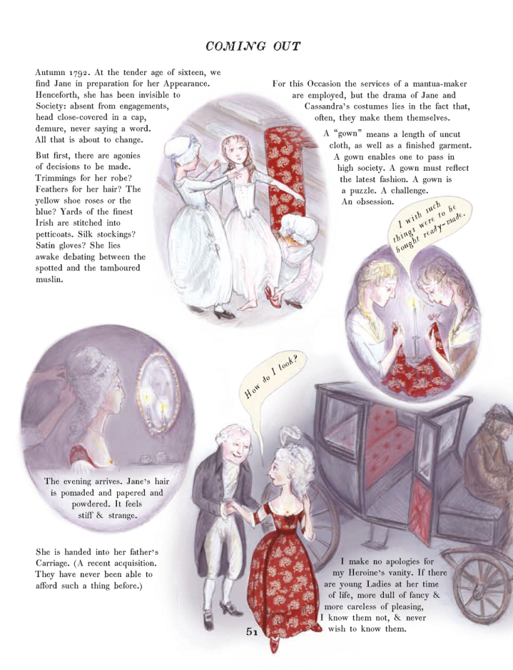 为此场合,裁缝师的服务固然不可或缺,但简与卡桑德拉服装这出“戏”的精彩之处在于:她们常常亲手缝制。“gown”一词既指一段未裁剪的布料,也指成衣。一件礼服能让人在上流社会通行无阻。一件礼服必须映照最新风尚。一件礼服是谜题,是挑战,是执念。