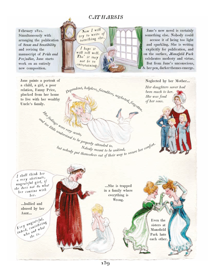 1811年2月。在安排《理智与情感》出版并修订《傲慢与偏见》手稿的同时,简开始着手创作一部全新的作品。简的新小说确实与众不同,没人能指责它过于轻快明丽。她明确为出版而写作,表面上,《曼斯菲尔德庄园》颂扬谦逊与美德。然而从简的无意识中,以及她的笔端,更暗黑的题材悄然浮现。