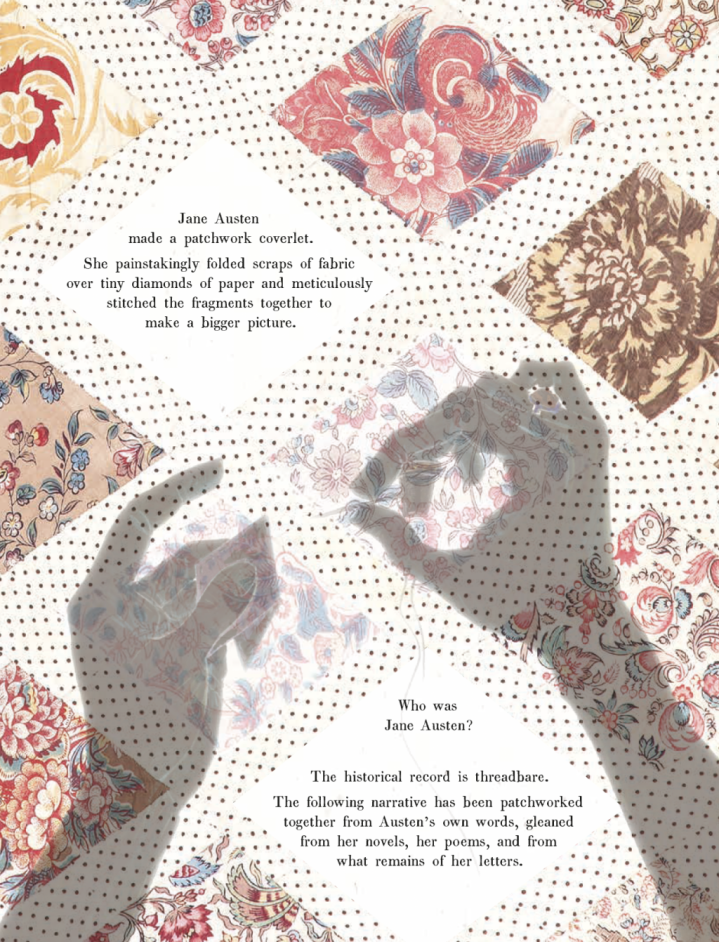 《百纳成锦》的作者是出生于1972年的漫画家凯特·埃文斯(KateEvans)。她先前已在Verso出版过革命家罗莎·卢森堡的图像传记《红色罗莎》(RedRosa:AGraphicBiographyofRosaLuxemburg,2015)、描绘法国加来难民营的纪实绘本《线索》(Threads:FromtheRefugeeCrisis,2017)。最新这本《简·奥斯丁图像传记》的灵感来自奥斯丁1810年与姐姐卡桑德拉和母亲共同缝制的一床拼布被。这床棉麻质地的被子实物现藏于奥斯丁故居博物馆,前述纽约奥斯丁纪念展亦悬挂了其巨幅照片。