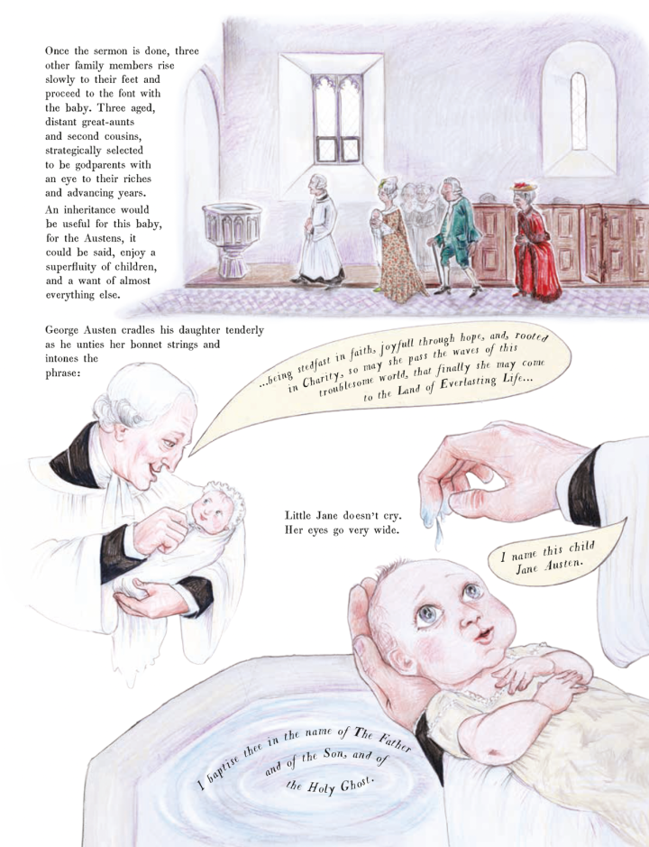 布道结束后,另外三位家庭成员缓缓起身,抱着婴儿走向洗礼池。三位年迈的远房姨婆和表亲,她们被精挑细选为教母,既因其丰厚家产,也因其风烛残年。对奥斯丁家而言,这个孩子若能继承遗产将大有裨益——可以说,这个家族最不缺的就是孩子,而除此之外几乎一无所有。