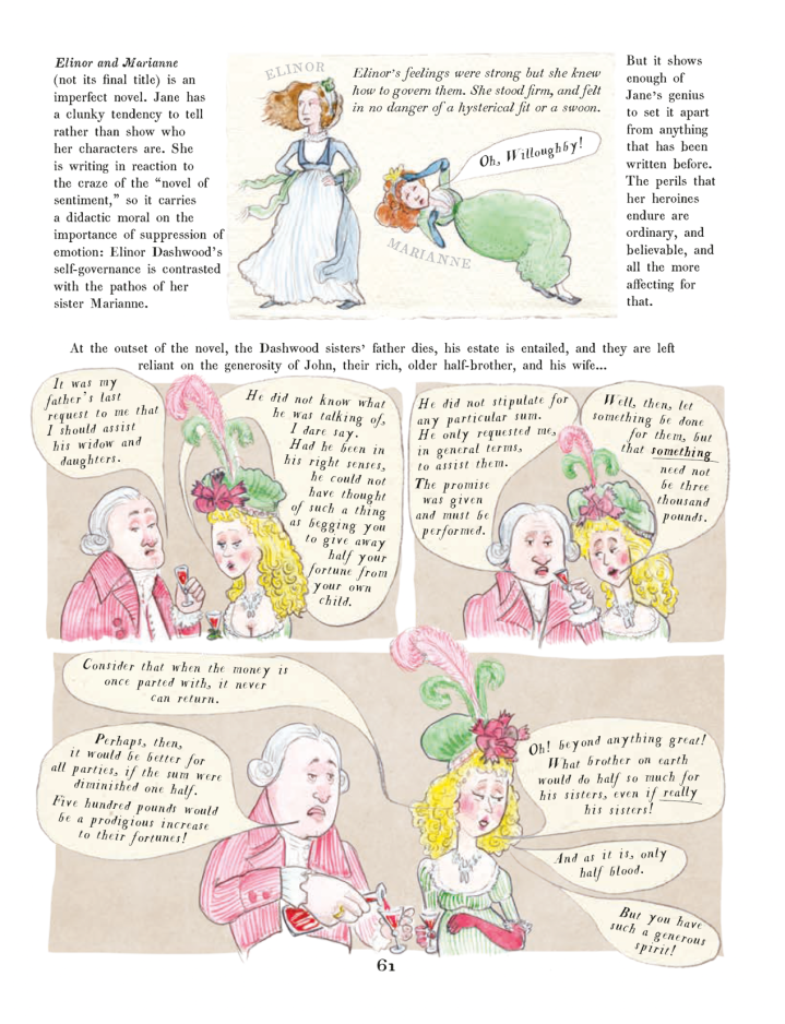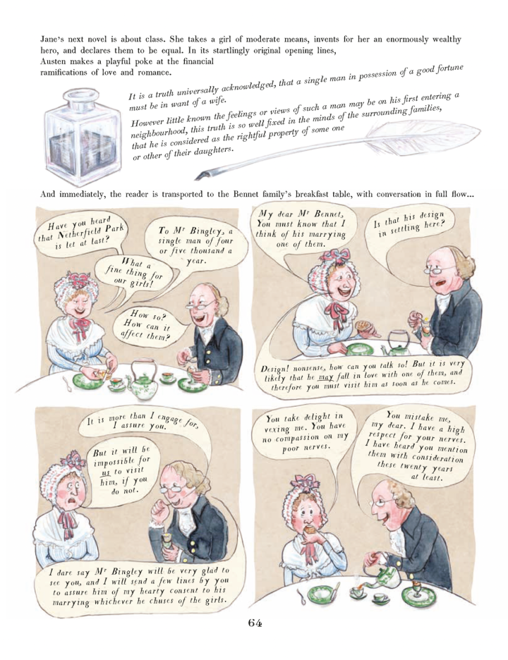 简·奥斯丁的下一部小说聚焦于阶级议题。她塑造了一位家境寻常的少女,为其虚构了一位富可敌国的男主角,却宣称两人地位平等。在小说极具开创性的开篇语句中,奥斯丁以戏谑笔触探讨了爱情与浪漫背后的经济现实。