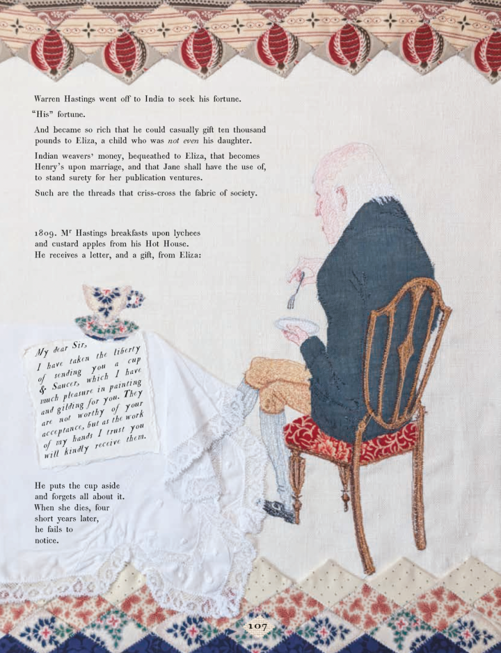 沃伦·黑斯廷斯远赴印度追寻财富,“他个人的”财富。他变得如此富有,以至于能随意赠予伊丽莎——一个甚至非其亲生的孩子——一万英镑。这笔源自印度织工的钱财,遗赠给伊丽莎,婚后则归亨利所有,而简也可以动用它以担保其出版事业。这些便是纵横交织于社会经纬中的线索。1809年,黑斯廷斯先生在吃早餐,享用着温室培育的荔枝和释迦。他收到了伊丽莎的来信与礼物。