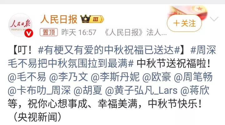 祝你心想事成、幸福美满,中秋节快乐!人民日报在社交平台公开了这样一个好消息,从而将中秋佳节的氛围拉满! 毛不易的中秋祝福,幽默风趣。这是月亮,这是不易,这是不易看见的月亮,这是月饼,这是不易,这是不易,要吃的月饼。月亮慢慢圆,好事慢慢判,月饼慢慢吃,祝福慢慢说。而歌手周深的中秋祝福,更加引人关注!